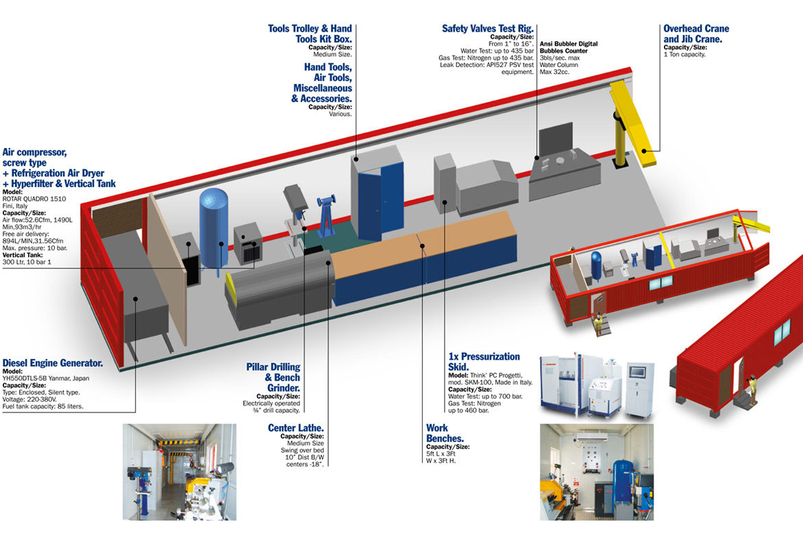 To be ready Care-O-Valve has designed a mobile container work shop (20 ft & 40 ft) full equipped for any kind of requirement and operation, suitable for onshore & offshore facilities.